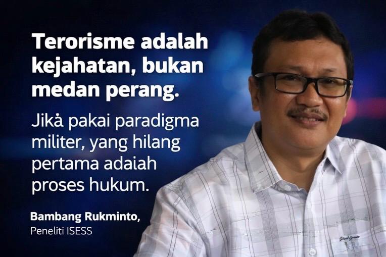 Ia menilai kebijakan pelibatan TNI justru berpotensi mendorong sekuritisasi isu terorisme secara berlebihan. Alih-alih memperkuat peran penegakan hukum oleh Polri, kebijakan tersebut dinilai bisa memperluas peran militer ke ranah keamanan dalam negeri. Jika dibiarkan berkembang tanpa batasan yang jelas, Bambang memperingatkan, situasi ini dapat menggerus prinsip negara hukum dan demokrasi.